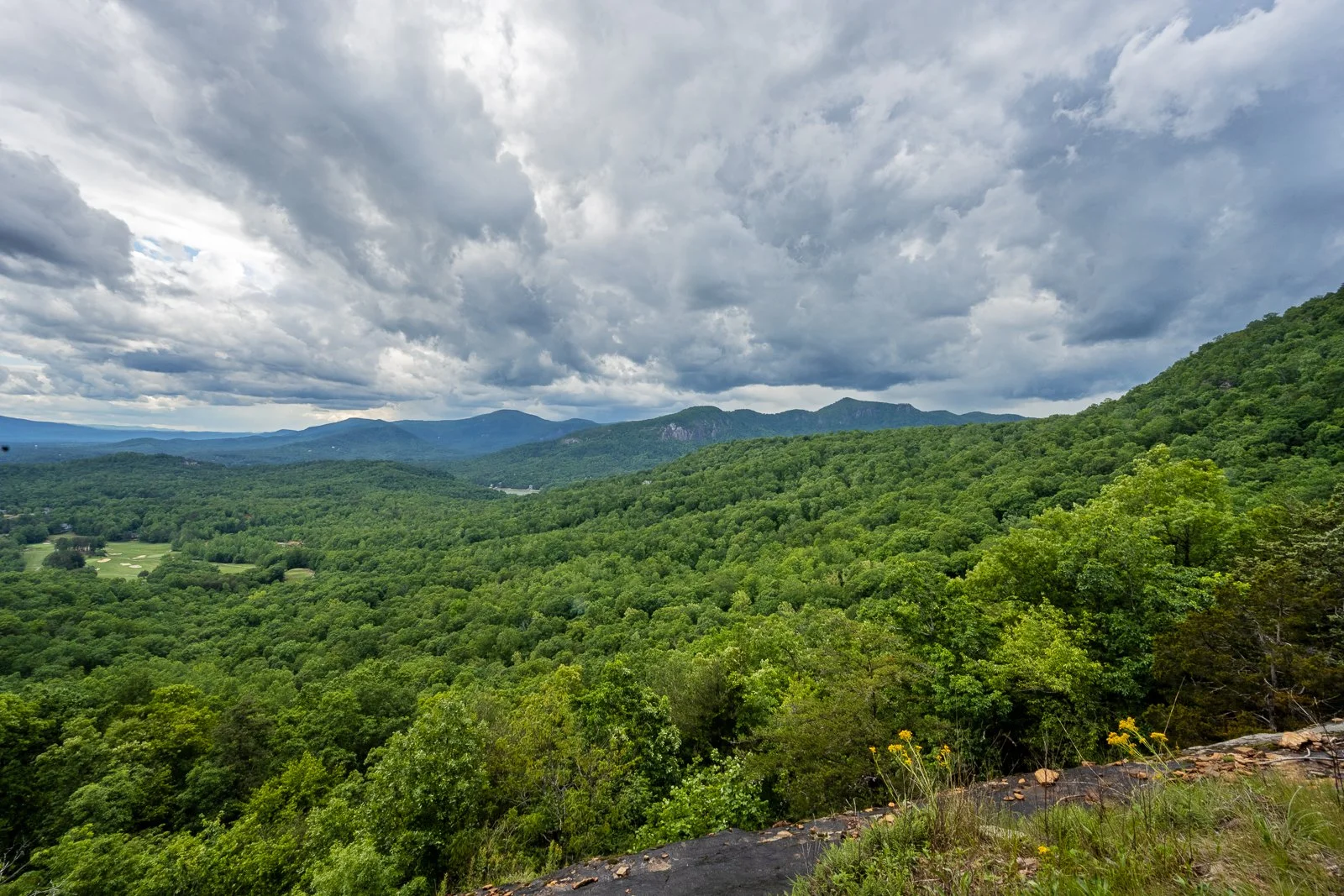 Conserving Carolina began pursuing protecting the land on Youngs Mountain in 2007, and facilitated the purchase of 96 acres from landowner Tommy Hartzog in 2013, the purchase of 300 acres from Tim Sweeney in 2017, and 19 more acres acquired from Hartzog in 2017, the same year the land trust formally purchased the land. The trail was not built until 2020 and opened to the public in April 2021. The trail was closed to the public in 2024 following Hurricane Helene, because of fallen trees, a landslide, a damaged stream crossing, and holes from torn-out root balls. Conserving Carolina’s volunteers known as Rock Crushers spent months cleaning up the trail and making it safe for the public, and it reopened again in February. I had not hiked this 4.2 out and back trail yet and was so impressed by the natural beauty along the trail and the views from the rocky outcroppings. It was particularly impressive the day we went, since gorgeous clouds filled the sky until the rain came at the end of our hike. Besides the spectacular views, the area is also home to lots of biodiversity, including rare mosses and lichens, wildflowers (apparently there are lots of bloodroot that bloom in March and April) native azaleas and the mountain laurel that was in full bloom. David Lee, Conserving Carolina’s natural resources manager, had this to say about Youngs Mountain: “This project beautifully combines conservation and sustainable recreation. Critical habitat for over 380 plant and animal species, including 25 rare species, is now permanently protected. All the while, the Youngs Mountain Trail expertly winds its way through spectacular hardwood forests and low elevation glade communities before terminating atop a granitic dome. This trail really shows off some of the best that North Carolina has to offer.“ Below are some more views of the surrounding area from the mountain.